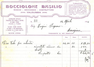 Iscrizione presso la Camera di Commercio di Novara da parte del Sig. Basilio Bocciolone. La Bocciolone si specializza nella lavorazione della lastra di rame. Ai primordi dell’industrializzazione della Valsesia, l’azienda aveva intuito che l’impiego di questo prezioso materiale dalle grandi possibilità di utilizzazione, grazie alla sua malleabilità e durata nel tempo, avrebbe consentito di passare dagli usi artigianali per la costruzione di arnesi domestici a quelli industriali della fabbricazione delle caldaie, impianti per cartiere ed altri complessi produttivi. Le caldaie delle prime macchine per il caffè espresso portavano il marchio “BOCCIOLONE”, che già allora annoverava tra i suoi clienti ditte come Arduino, Ansaldo, Bemberg, Cimbali, La Carimali e tanti altri nomi allora di grande prestigio. L’Azienda nasce a Valduggia presso la casa storica della famiglia Bocciolone in via Romagnasco e confinante con la famosa fabbrica di campane della famiglia Mazzola.