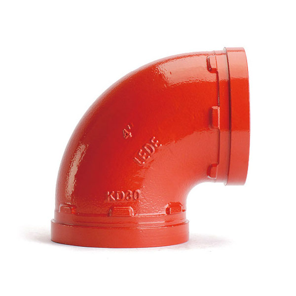 Curva 90° scanalata omologata UL/FM, verniciata rosso. A corto raggio, per installazioni antincendio e termoidrauliche. Pressione max. 21 bar