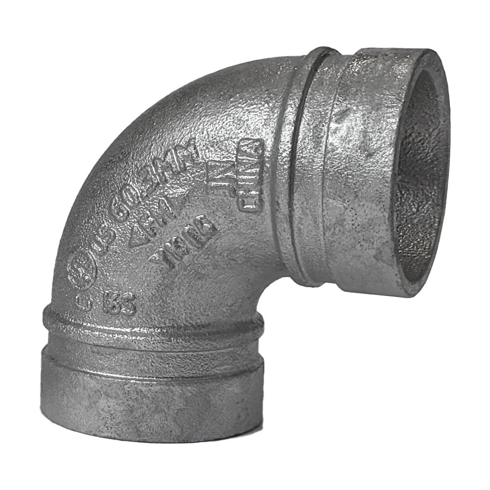 Curva 90° scanalata omologata UL/FM, zincata a caldo. A corto raggio, per installazioni antincendio e termoidrauliche – pressione max 21 bar. Idonea per acqua potabile.