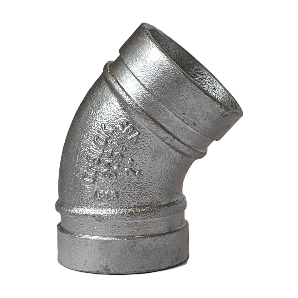 Curva 45° scanalata omologata UL/FM, zincata a caldo. A corto raggio, per installazioni antincendio e termoidrauliche – pressione max 21 bar. Idonea per acqua potabile.