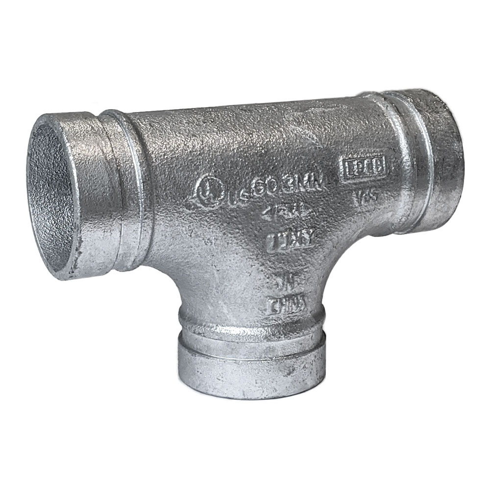 TEE scanalato omologato UL/FM, zincato a caldo. A corto raggio, per installazioni antincendio e termoidrauliche – pressione max 21 bar. Idoneo per acqua potabile.