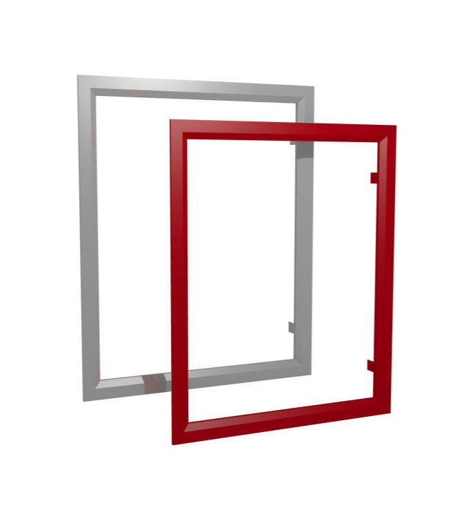 – Cassetta a bordi arrotondati, da interno a parete con portello pieno, DN 45 “Murano Collection”, in acciaio al carbonio verniciato in poliestere raggrinzante rosso RAL 3000. Dim. mm H 500 x 400 x 160