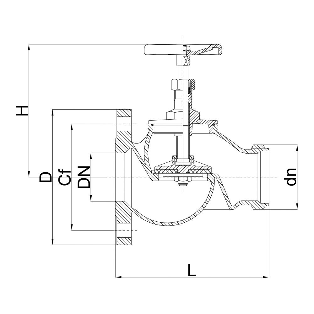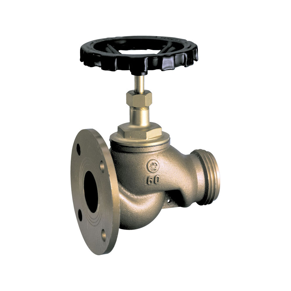 Corpo valvola in bronzo e vitone in ottone (corpo in ottone per il DN 40), attacco flangiato, uscita filettata maschio UNI 810