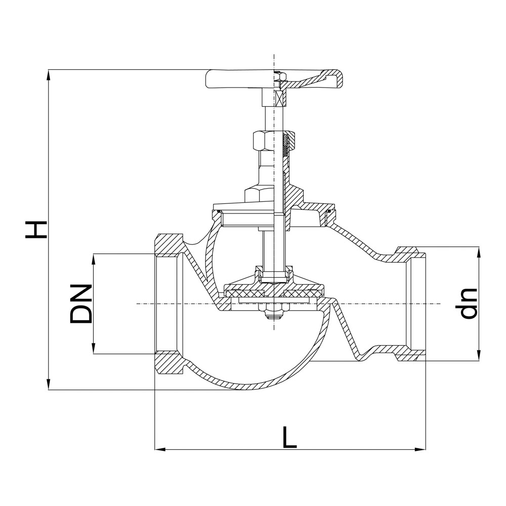 Corpo valvola in bronzo e vitone in ottone, attacco filettato femmina gas, uscita filettata maschio UNI 810 EN 1982.